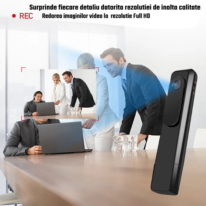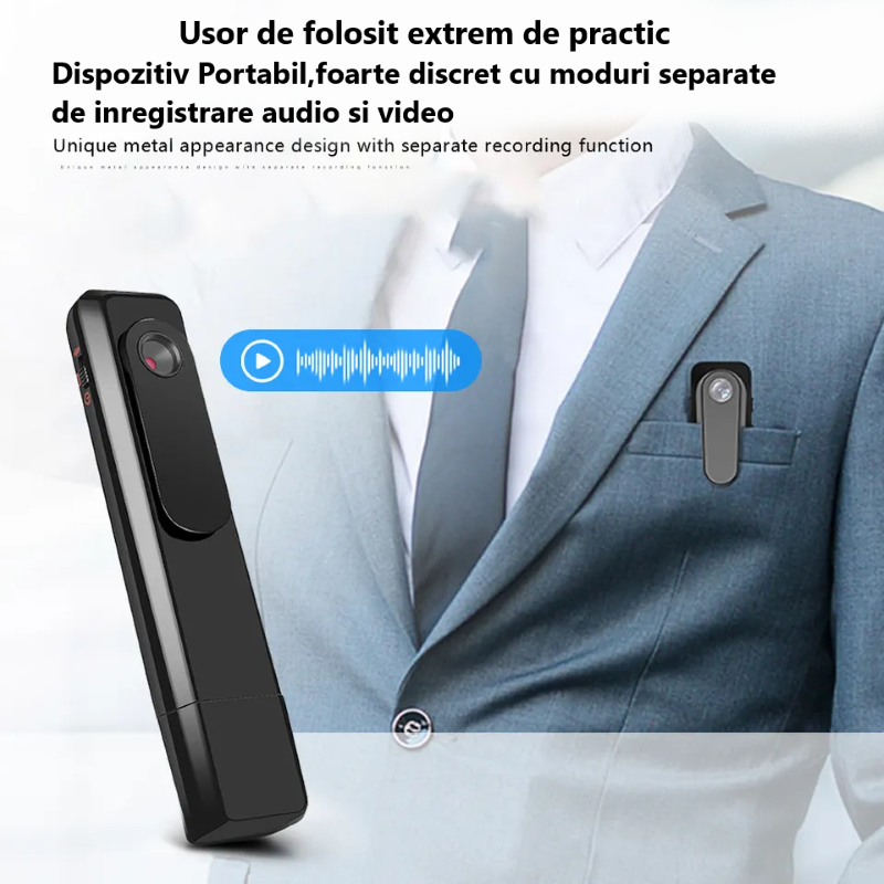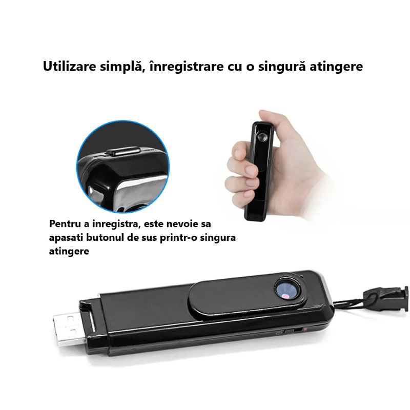 Pentru a putea inregistra atat video cat si audio, este nevoie sa apasati butonul din partea de sus a dispozitivului, astfel aceasta va incepe sa inregistreze video sau audio in functie de preferintele dumneavoastra,iar la final este nevoie sa apasati din nou butonul pentru a oprii inregistrearea. Dispozitivul este unul micut si discret asta ai confera un avantaj de-a nu fii observat, dar si faptul ca este protabil astfel il poti pune unde doresti.