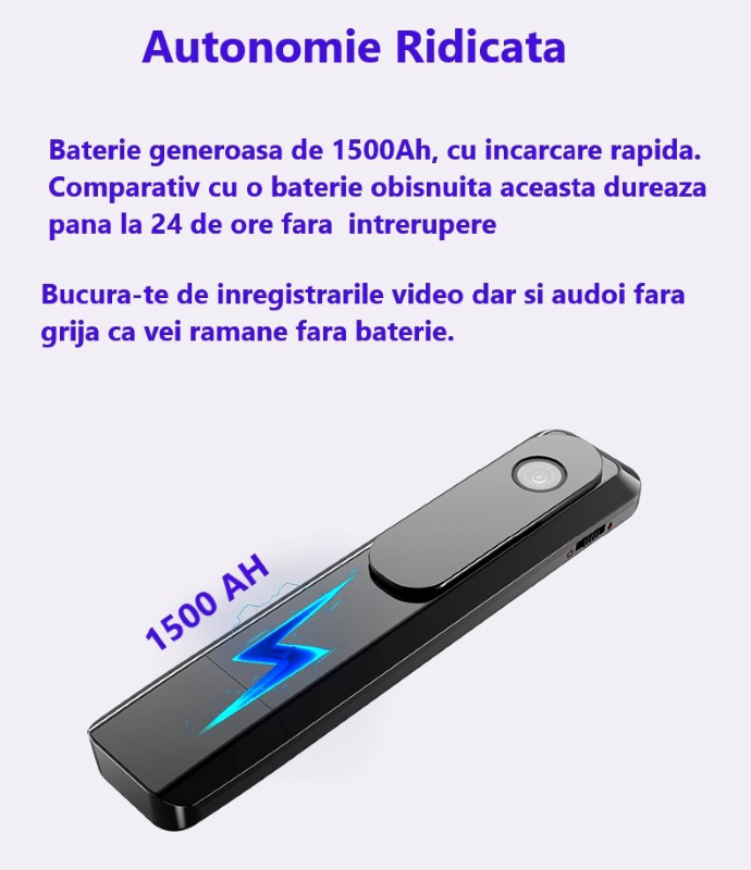 Dispozitivul beneficiaza de o baterie generoasa de 1500 de Ah cu incarcare rapida, iar comparativ cu o baterie obisnuita aceasta dureaza pana la 24h fara intrerupere. Bucura-te de inregistrarile video dar si audio fara grija ca vei ramane fara baterie.