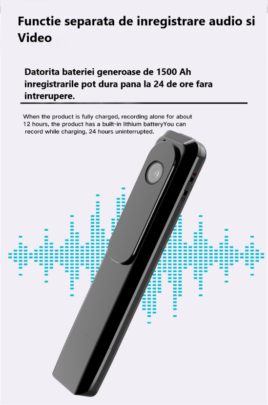 Captati chiar si cele mai subtile nuante ale sunetului, fidelitate audio de neegalat cu noua tehnologie de anulare a zgomotului. Nu pierzi nici un sunet,datorita microfonului de inalta calitate care va capta orice sunet chiar si de la distanta. dispozitivul avand functii separate atat de inregistrare video, cat si de inregistrare audio, prin comutarea unui singur buton.