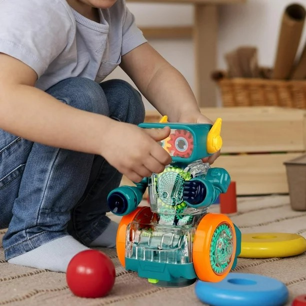 Robot Rotating Gear interactiv, cu sunete si lumini. Este jucaria ideala pentru copiii curiosi si dornici de distractie. Componentele transparente ale robotului si rotitele din interiorul acestora ajuta copilul sa inteleaga cum functioneaza mecanica, si astfel sa inteleaga cum functioneaza anumite jucarii. Sunetele si luminitele sincronizate cu miscarea rotitelor vor oferi garantat un grad ridicat de divertisment. Dotat cu sistem bump&go (isi schimba singur directia de mers cand intalneste obstacole).
